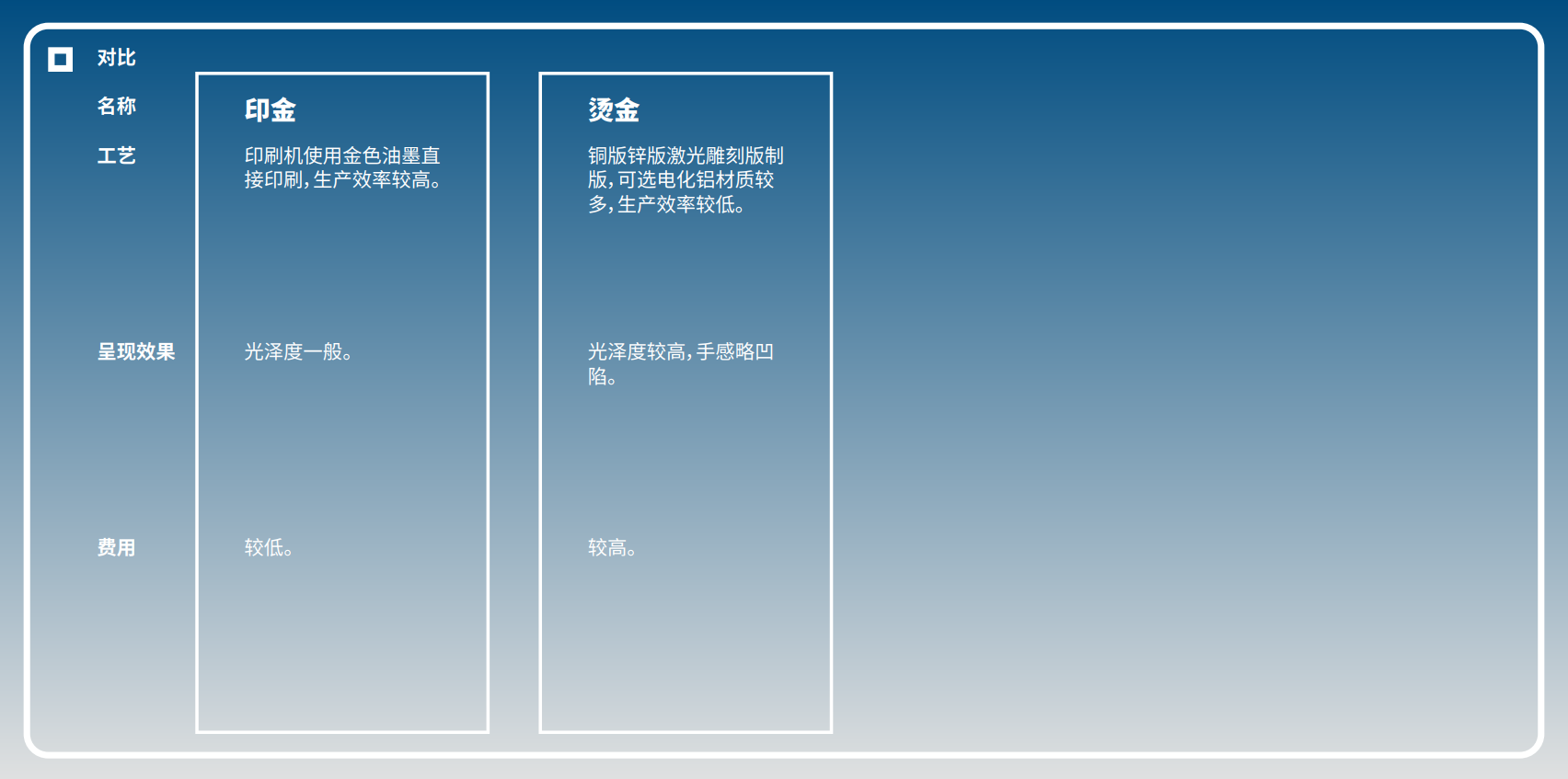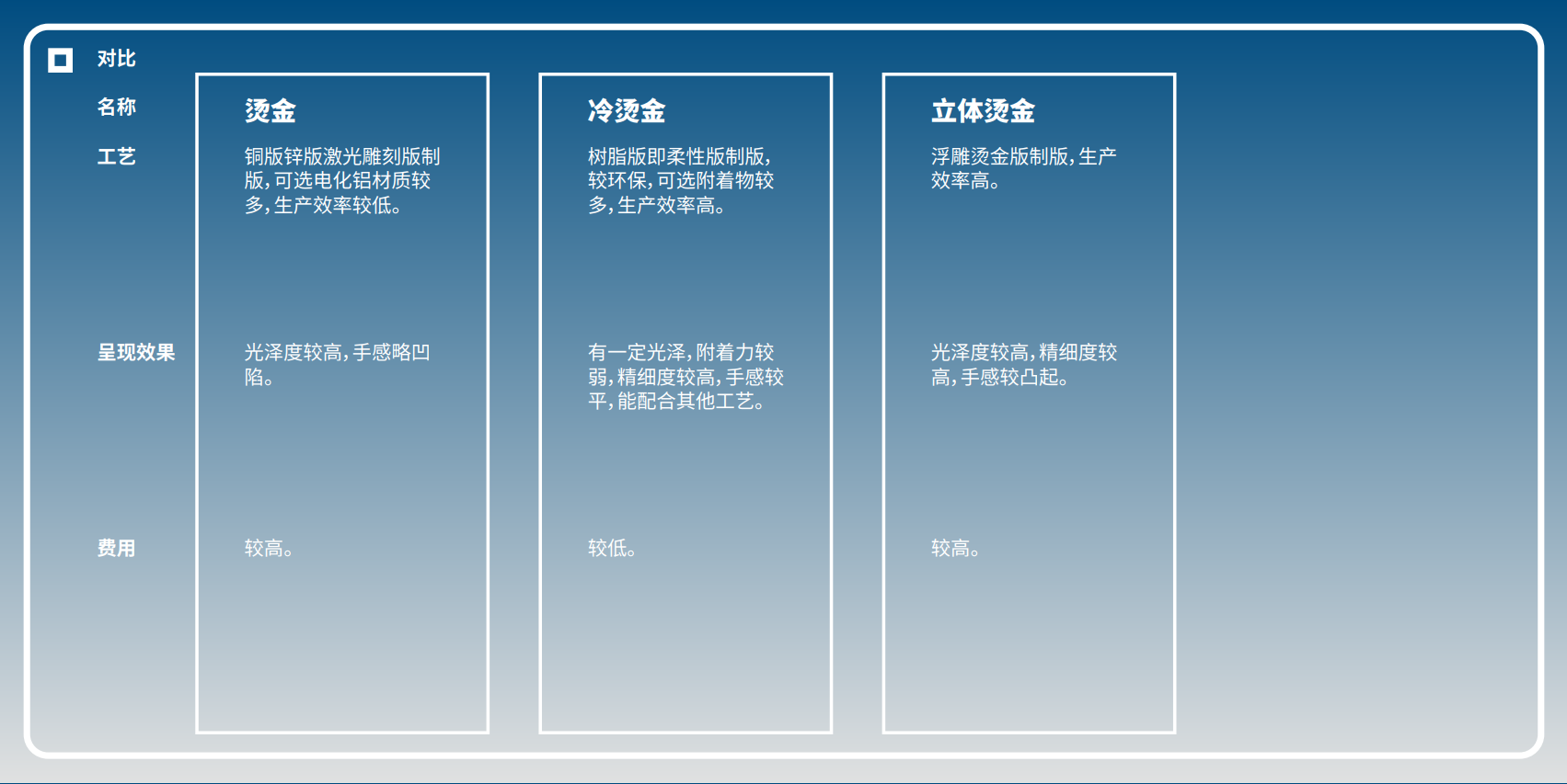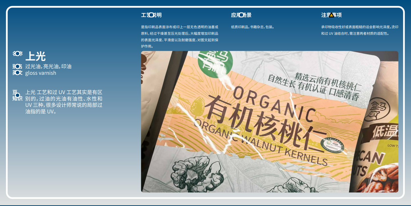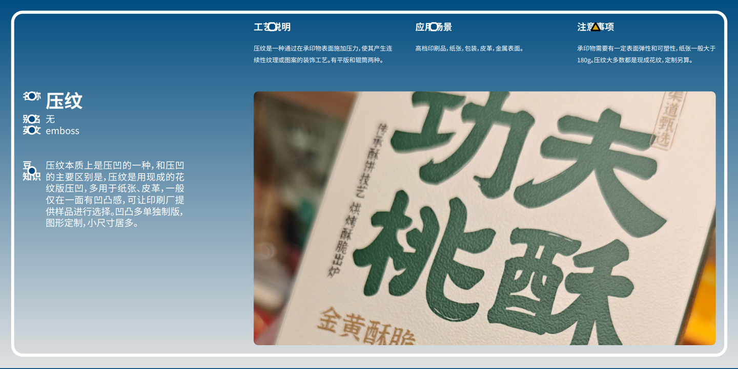 基础印刷工艺:丝网、胶版、凹版、凸版、垫白、印专色、印金、烫金、冷烫、击凸、压凹、压纹、压痕、激光模切、浅雕、刀模、压点线、覆膜、亮膜、哑膜、珠光膜、拉丝膜、触感膜、镭射膜、上光、过油、珠光油、发泡油、替塑油、局部uv、逆向uv、磨砂uv、uv折光、光刻、猫眼、彩葱、植绒、视高迪、光栅、刮刮银、刷边等等印刷工艺。